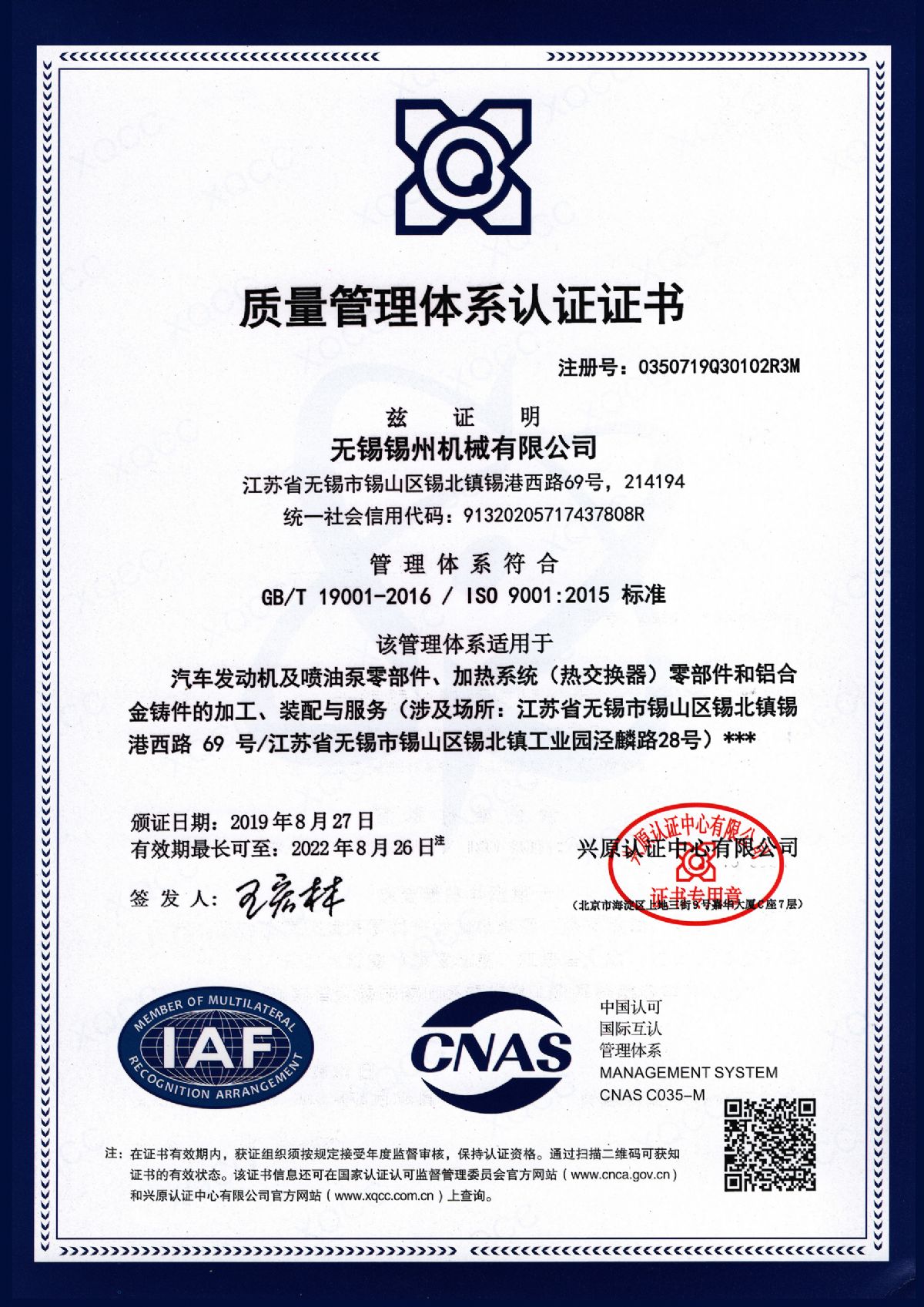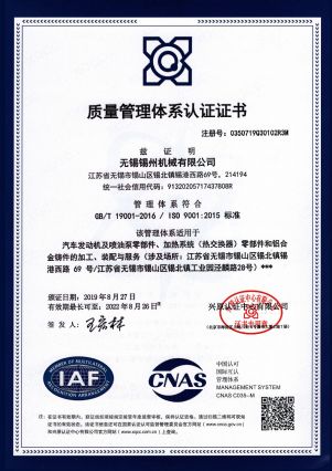 “ 以質量求生存,以管理增效益”是錫州機械堅定不渝的經營理念;“質量第一、客戶至上”是錫州機械堅持不懈的追求;“ 以人為本,鑄就優質產品, 精益求精,增強顧客滿意”是錫州機械持之以恒的質量方針。 2001年7月公司通過ISO9001:2000質量體系認證, 2005年9月通過ISO/TS16949質量體系認證。公司于2007年7月通過產品ASME認證。 通過開展以產品質量為中心的企業管理,公司以先進的生產檢測設備、完善的質量保證體系、嚴密的產品開發體系、嚴格按照標準開展產品生產管理,并開展6S現場管理,竭盡全力創造一個比較清潔、健康、安全的環境,全方位地滿足國內外客戶的要求。